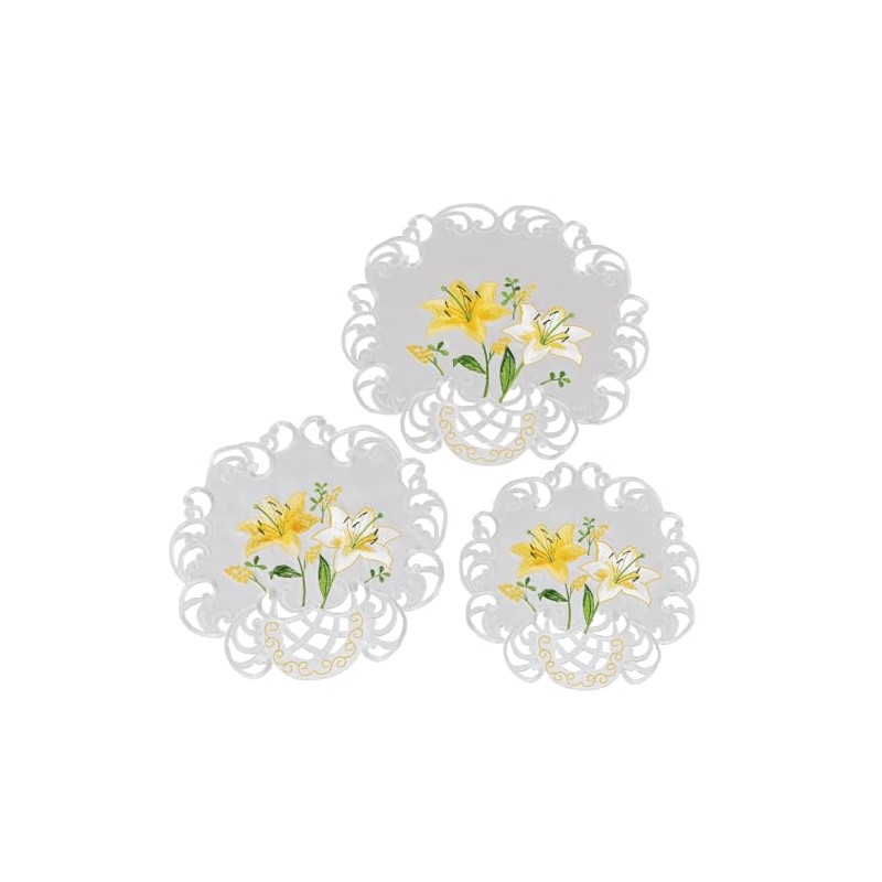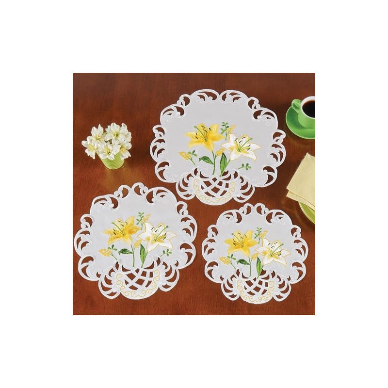 Perfect for your Easter table, these linens feature embroidered lilies atop a white background. Available as a runner or set of 3 doilies, the linens have intricate cut-out scrolling and lattice designs. They're perfect to use alone or with a coordinating tablecloth underneath (sold separately). Machine wash. Polyester; imported. Choose: Set of 3 Doilies (9", 11 1/2" and 14"Dia.) or Runner (69"L x 13"W).