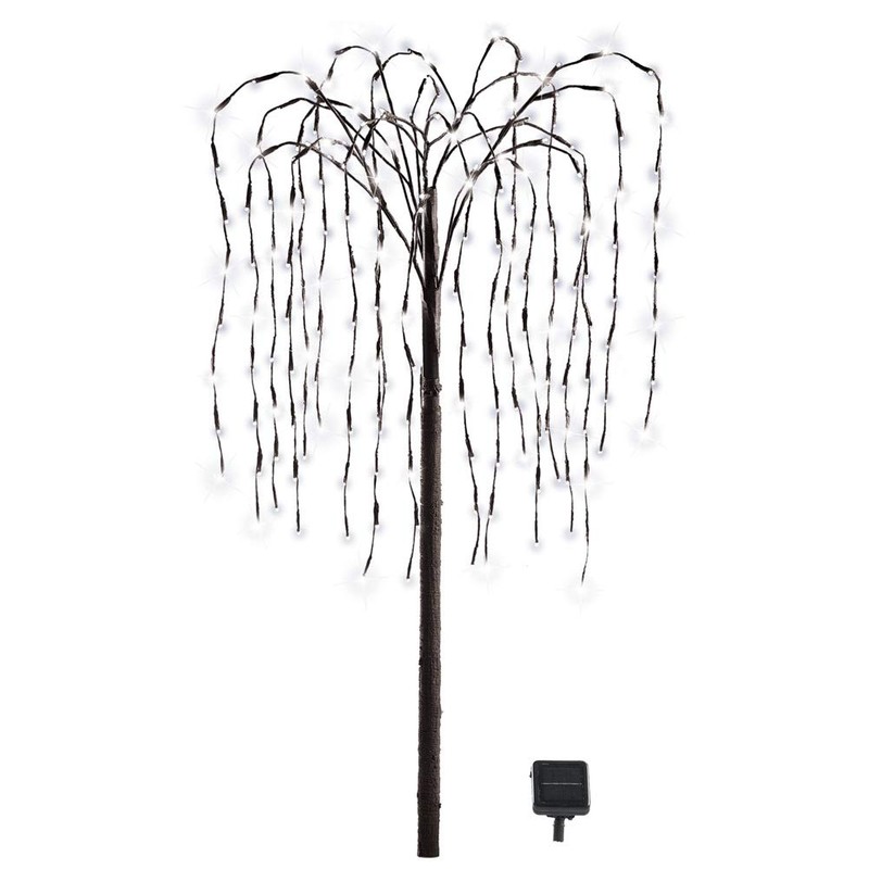 **Description** If you're in the market for unique outdoor lights that don't drain your budget or weigh down your energy bill, you'll love this solar willow tree featuring 200 glimmering LEDs. Perfect as a unique alternative to basic pathway lights, patio lights or holiday lights, this exquisite light-up tree packs on the personality. It's a wonderful solar garden accent for year-round use, as it will help you welcome spring, celebrate summer and usher in the holidays. Made from iron and plastic. Comes with an AA battery.