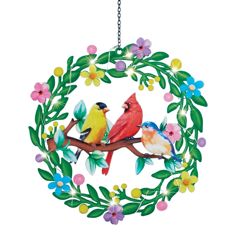Day and night, this mobile features a wreath of colorful flowers surrounding a trio of birds perched on a branch. The wreath automatically shines with solar-powered light at night. Includes a "AA" rechargeable battery and a chain with a hook at the top for easy hanging. Metal and plastic. Approx. 12 1/2"Dia. with 15"L chain.