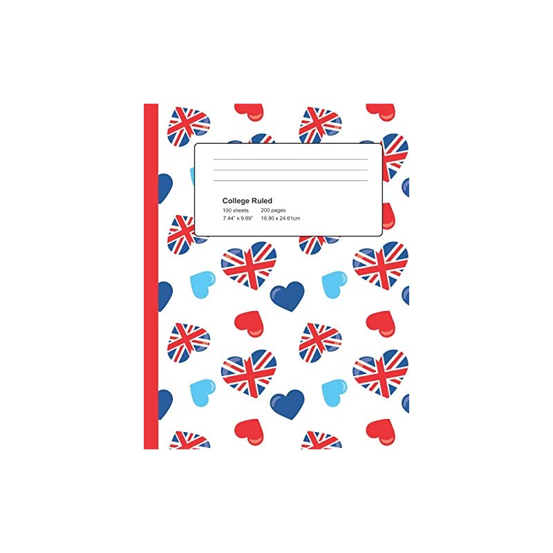 College Ruled Composition Book: Perfect London England Notebook 200 Sheets 100 Pages 7.44 x 9.69 inch Book with English Flag Hearts