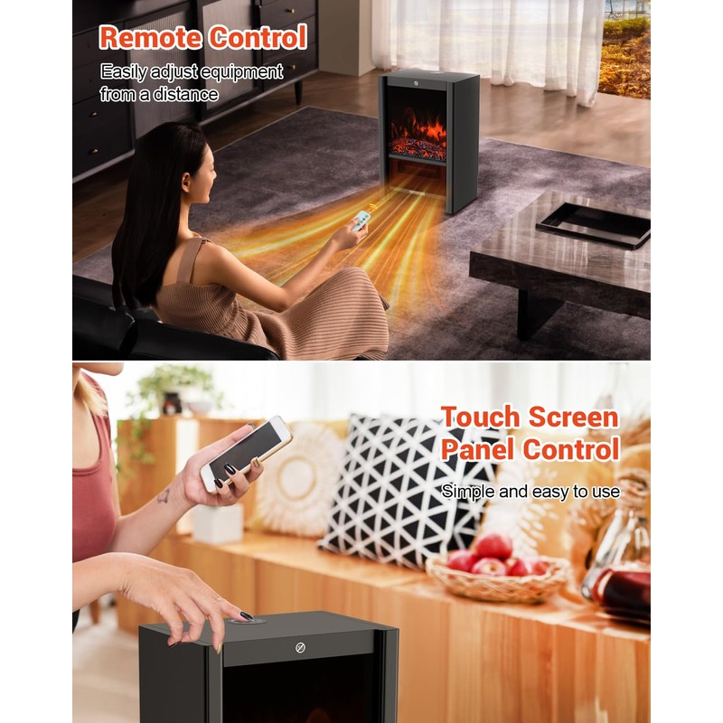 - 2 Control Modes: touch screen and remote control. In order to bring you great convenience, the flame, heat and timer can be controlled not only by the touch button, but also by the convenient remote control. 5 3D charcoal and flame brightness adjustment, you will see beautiful flames rising from the vivid firewood, flame atmosphere and hot wind can be used separately, which will enhance the atmosphere of your home or office.