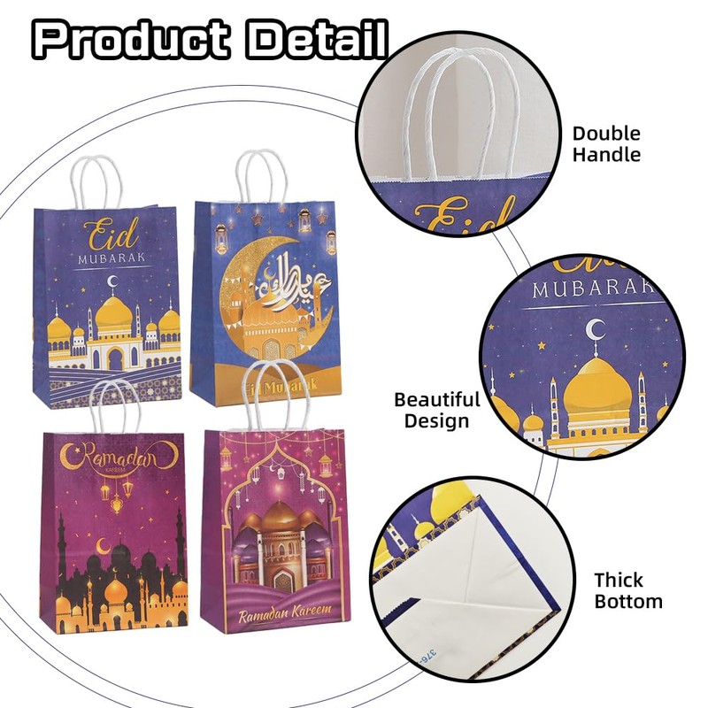 - 【Exquisite Design】: Enjoy the 12 high-quality gift bags featuring intricate Eid Mubarak themes in classic colors like purple, blue, and gold. Imprinted with elements symbolizing the holy month such as lanterns, moons, stars, and mosques, perfect for the Eid Mubarak celebration.