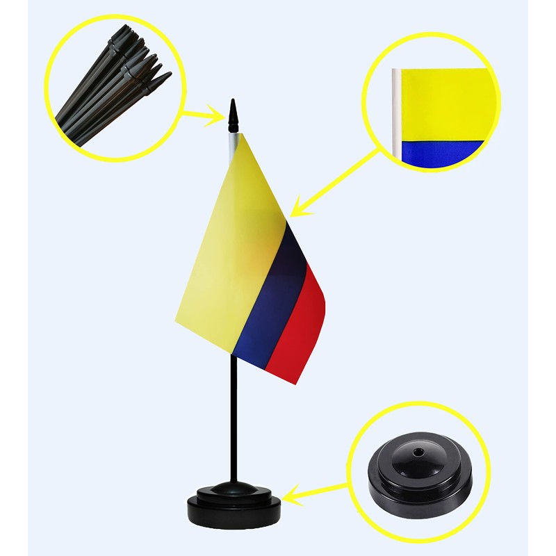 Material: Made of 100% durable polyester and black solid plastic sticks with a spear top. comes with a black plastic base to keep the Colombia Flags Colombian flag standing steadily on your desk.