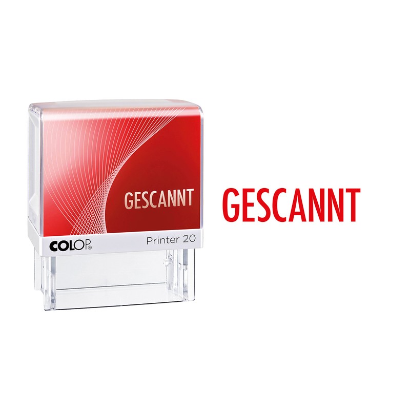 - The Colop stock text stamp includes a plate with the lettering GESCANNT, which can be printed up to 5,000 times in red colour on absorbent material without compromise.