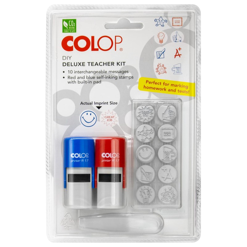 Colop Teacher - Juego de sellos con temática de profesor, sellos autoentintados rojos y azules con 10 mensajes únicos y pinzas para cambiar fácilmente los mensajes, ideal para tareas y marcar pruebas