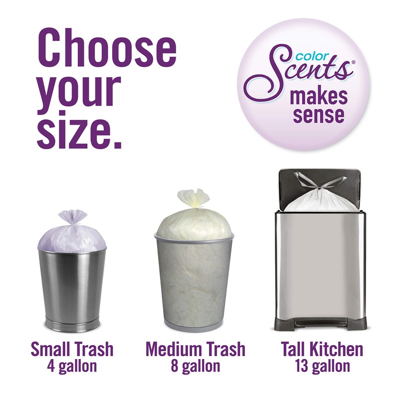 - SCENTED TRASH BAGS: Color Scents is your secret tool, these scented garbage bags deliver subtle bursts of scent to help maintain an inviting smell while helping to combat trash odors.