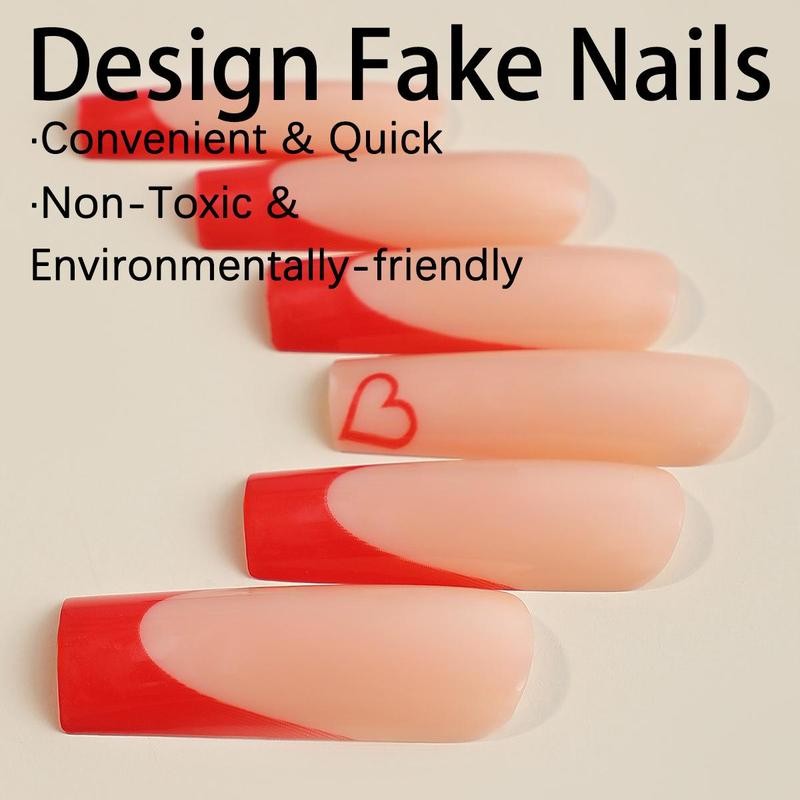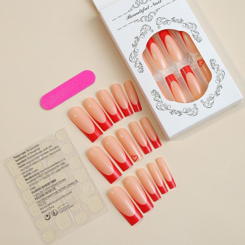Colorblock Heart Pattern Acrylic Nail Kit with Nail File & Glue Tape, 24pcs Glossy Long Square Press on False Nail for Women and Girls