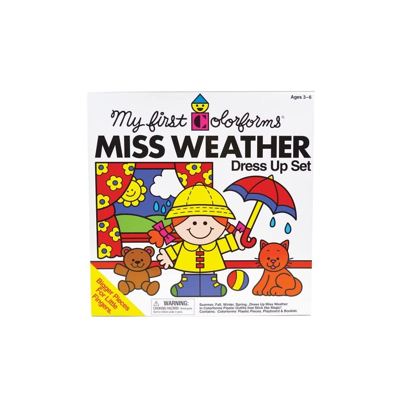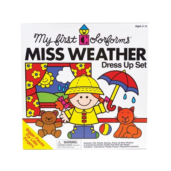 A reproduction of the classic set designed in the 1970s, this educational set is perfect for teaching preschoolers how to dress for the weather. Includes play board and plastic outfits for Miss Weather, for any season of the year! Colorforms Stick-Ons are bigger for little hands.
