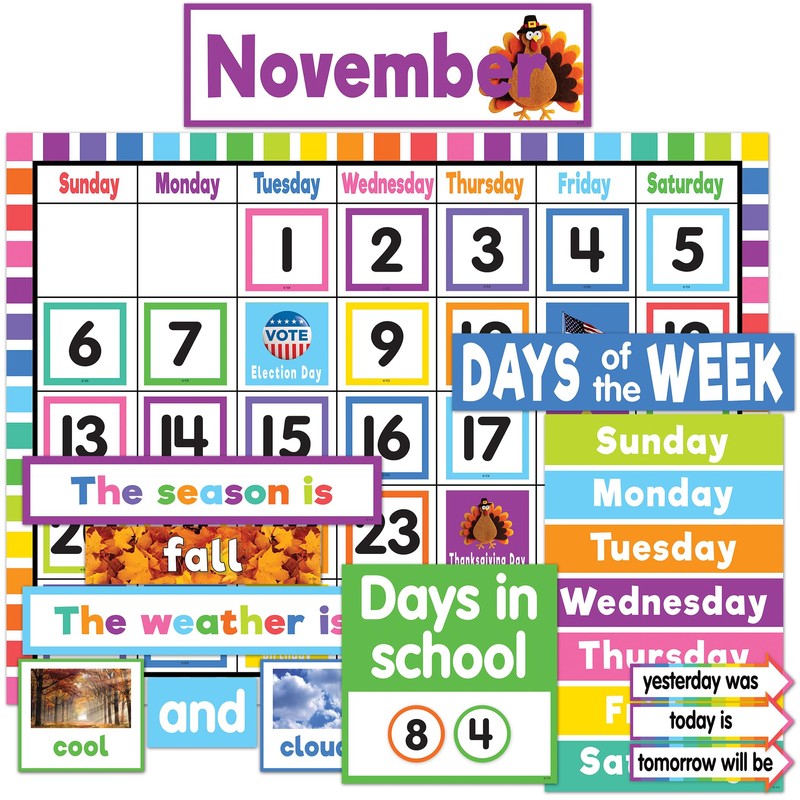 This bright and colorful calendar display comes with easy-to-read number pieces, colorful monthly headers, and additional pieces for holidays and special occasions. It also includes pieces for counting days of the school year, the weather, seasons, days of the week as well as for yesterday, today, and tomorrow. Blank calendar measures 24" x 18". 144 total pieces.