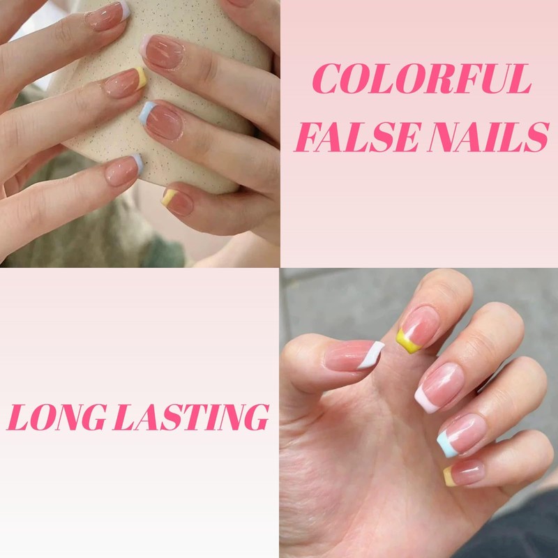 Colorful French Tip Press on Nails - French Tip Square False Nails - Summer Pastel Acrylic False Nails with Glue- Full Cover Nail Tips Long Lasting Stick on Nails for Women Girls Nails Art 24pcs