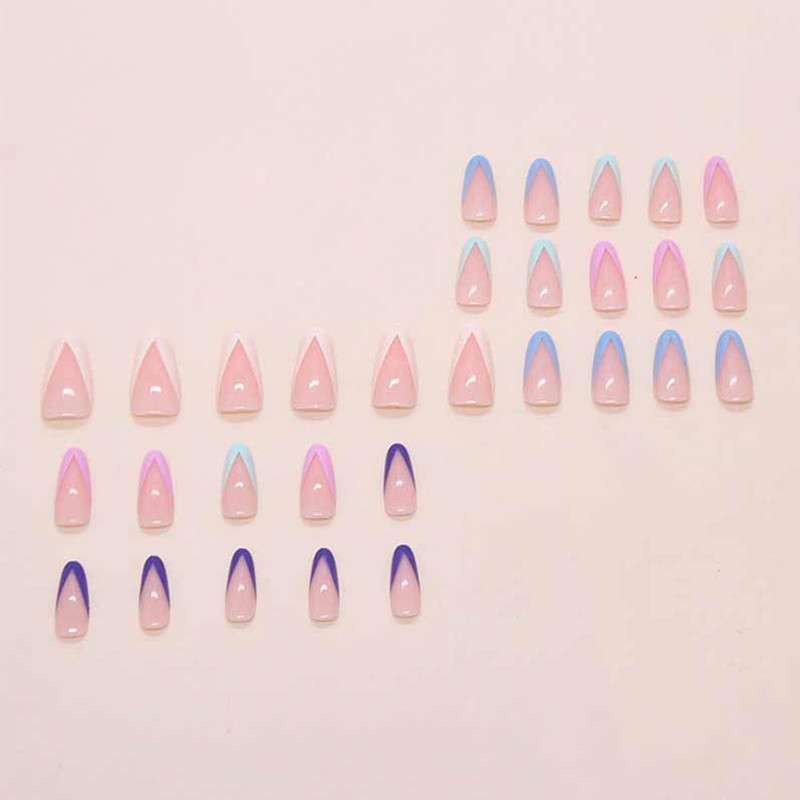 Colorful French Tip Press on Nails Medium Long Stiletto Fake Nails with Designs Rainbow Bar Full Cover Almond Nail Tips Fake Nails Reusable Glossy Pink Acrylic Nails for Women Manicure 24Pcs