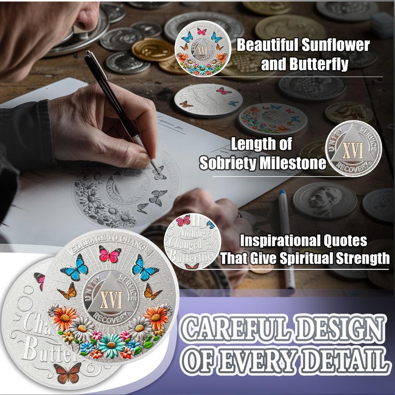 - Embrace Change: This colorful sunflower sobriety coin inspires us to remain courageous and hopeful in our sobriety through flowers, butterflies, and an inspirational motto. At the same time, this AA gift reminds us of the need to be courageous and transform ourselves through the challenges of the sobriety journey. AA medallion is not only a tool for self-motivation, but can also be used as a gift of encouragement and support to others, conveying our care and encouragement