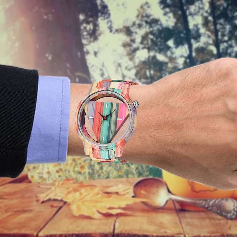 Colorful Triangle Wood Watch Men's Skeleton Dial Full Wood Quartz Watch Unique Inverted Geometry Wood Watches for Men -Pink