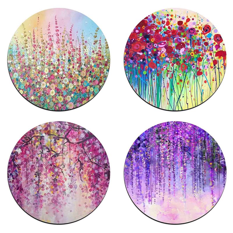 Colorful Watercolor Flowers Round Coaster Set - Made of Recycled Rubber - Set of 4