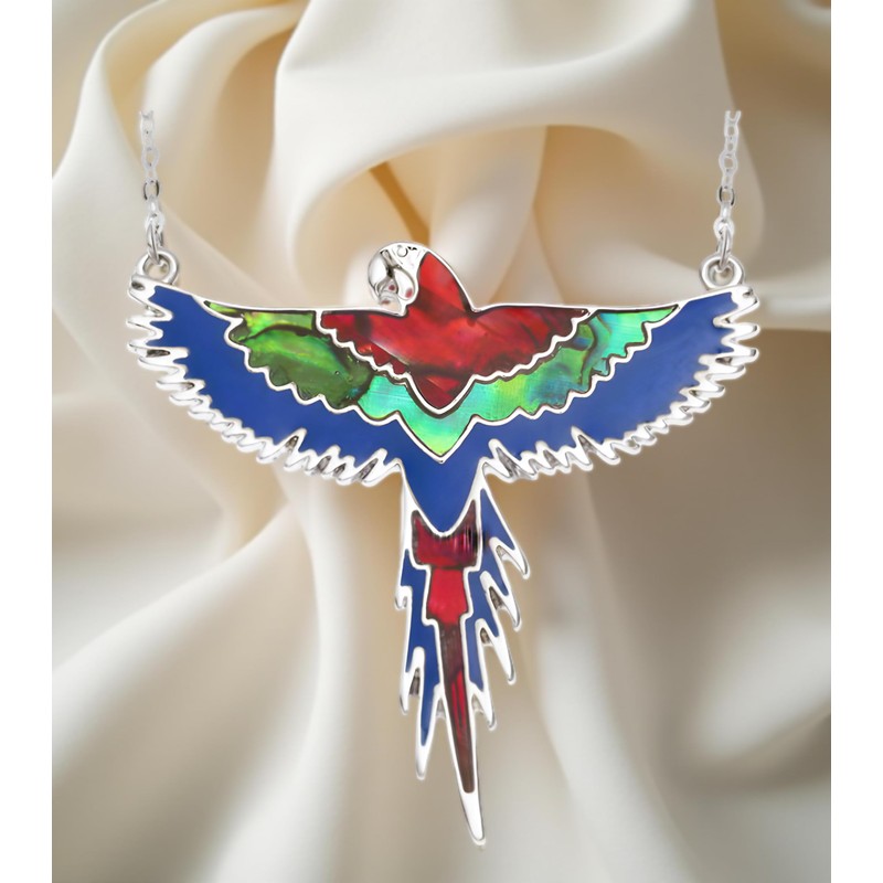 Colourful Macaw Parrot Necklace in Sterling Silver – Paua Shell Inlay Bird Pendant – Tropical Wildlife Statement Jewellery for Women – Nature-Inspired Jewellery Gift
