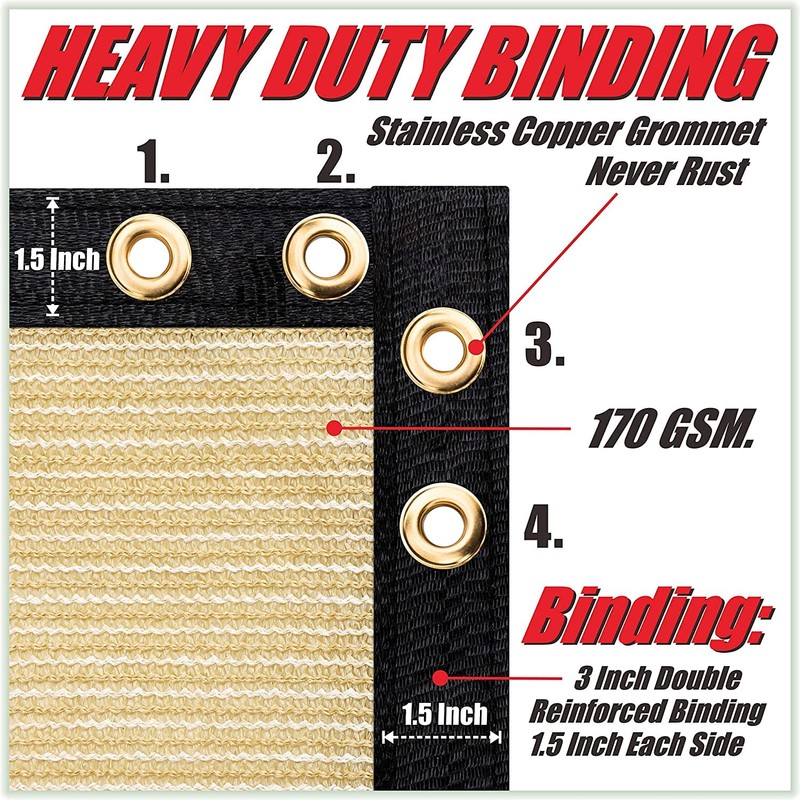 - ★【Comes with the Extra Stainless Grommets and Reinforced Binding】: Grommets are made of stainless copper, each corner has 4 grommets (compares to similar products on the market only have 1-3 grommets), more grommets are placed evenly along all edges, 12 inches apart vertically, 24 inches horizontally. All edges are covered with Beige reinforced 3-inch binding (1.5-inch on each side). The grommets and bindings help the screen to hold up in the wind.