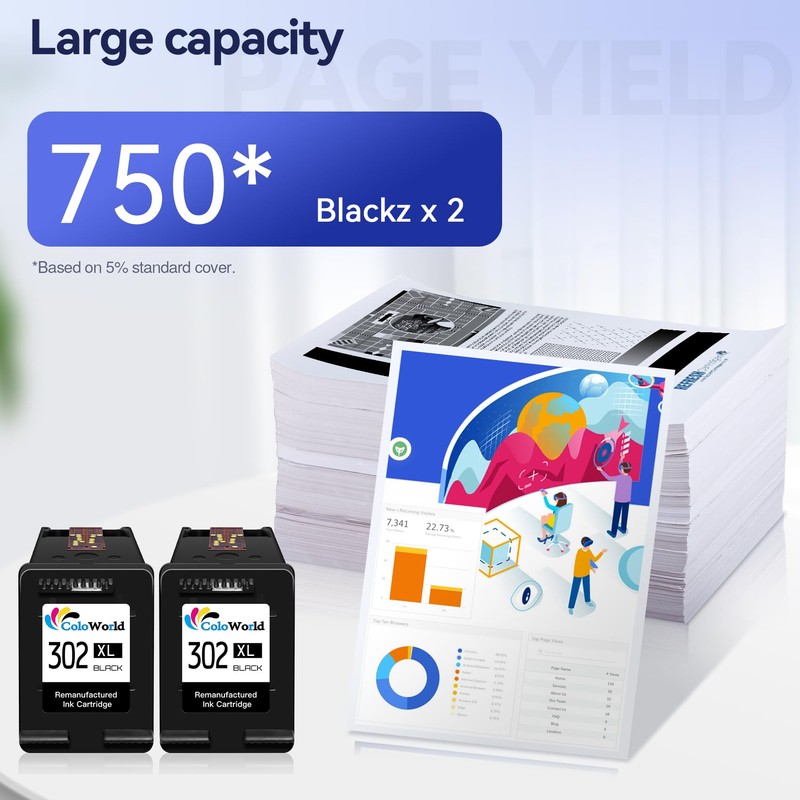 - 302XL printer cartridges, page yield: 750 pages per 302XL printer cartridges, black (based on 5% coverage)