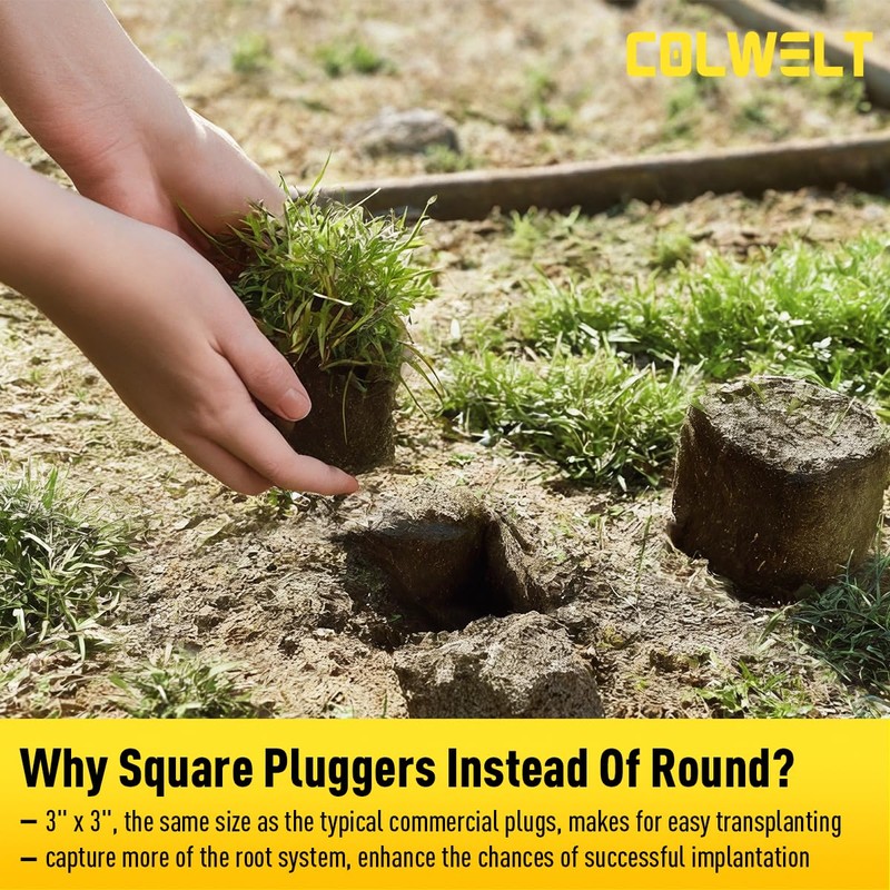 Colwelt Sod Plugger Tool 36-INCH, Grass Plug Tool 3 x 3 Square with Serrated Base, Long Handle Bulb Planter Tool with Dual Pedals & Easy Foot Ejector, Sod Turf Cutter for Lawn Planting Grass Repair