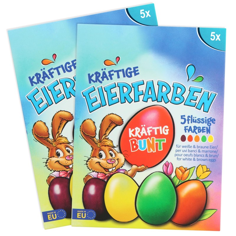- Box contents: 10 x liquid egg colours (2 x each colour), instruction manual (on the packaging). Volume: approx. 50 ml (10 x 5 ml). Egg colour: purple, yellow, red, green, orange
