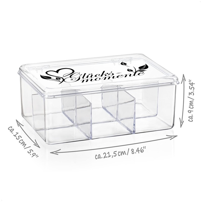- Box contents: 2 x tea boxes (1 x each lettering). Dimensions: approx. 21.5 x 15 x 9 cm (width x depth x height). Dimensions of each compartment: approx. 6.5 x 6.5 cm. Material: plastic. Colour: transparent, black. Number of compartments: 6. Not dishwasher-safe. Lettering: "Tea Time", "Glücksmomente"