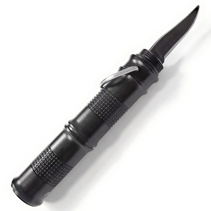 The tactical pen features a flint, a whistle, a compass, a scalpel blade and a cotton pad!