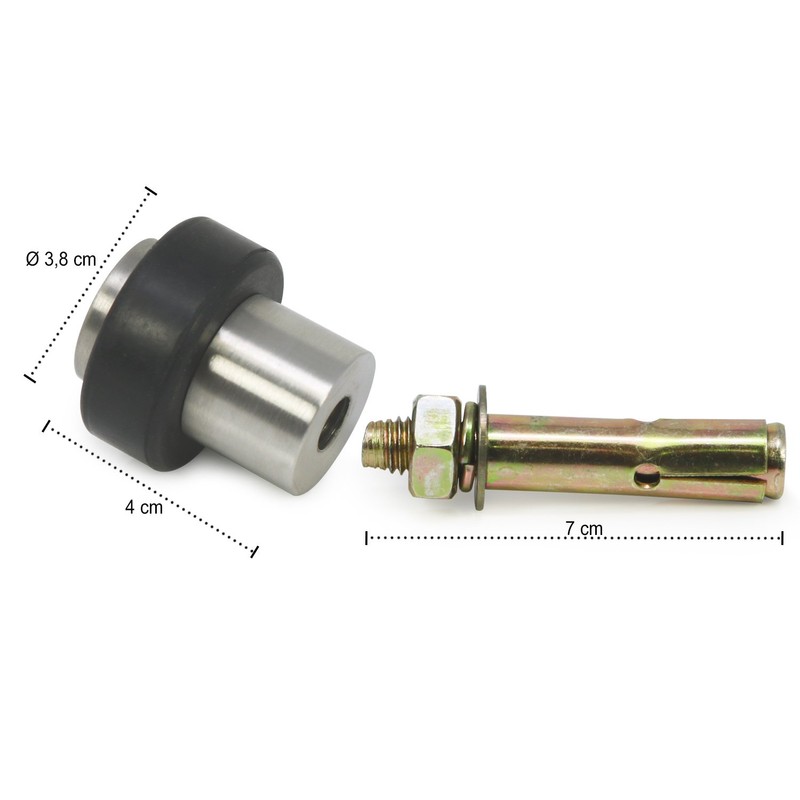- Material: stainless steel, rubber. Door stop dimensions: 4 x diameter 3.8 cm. Dimensions anchor dowel: 7 x diameter 2 cm (with nut and screw)
