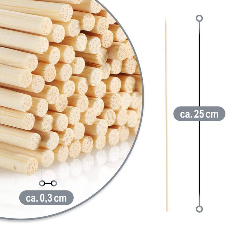 • Box contents: 500 x wooden skewers. Dimensions: approx. 25 x 0.3 cm (length x diameter). Material: wood. Colour: natural. Note: food-safe