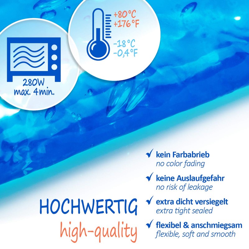 - FOR HEAT: Place the hot/cold gel compress in hot water at 80°C for approximately 4 minutes or heat in the microwave for up to 2 minutes. Then wrap the gel bag with a tissue to treat the sore area! Relieves pain!