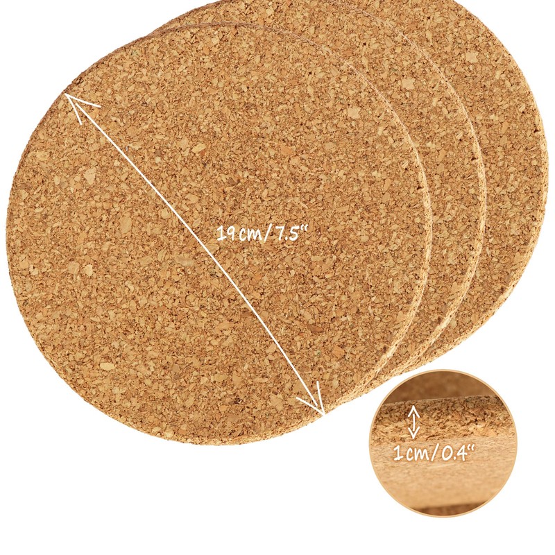- Box contents: 8 x trivets, dimensions (diameter x height): approx. 19 x 1 cm. Material: cork. Colour: brown