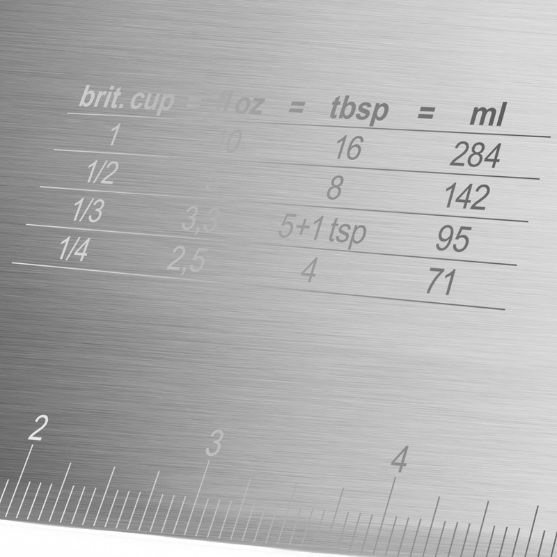 Thanks to the different measuring scales, the dough cutter is best used for separating, measuring, spreading and smoothing.