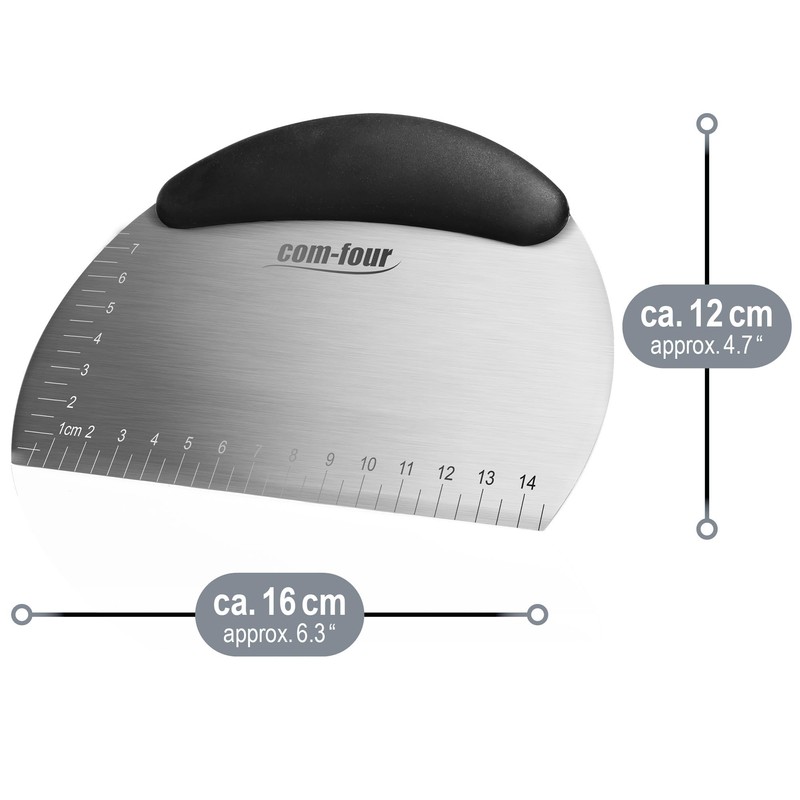 - Box contents: 1 x dough spatula. Dimensions: approx. 16 x 12 x 2 cm (width x height x depth). Spatula width: approx. 15 cm. Material: stainless steel, plastic. Colour: silver, black