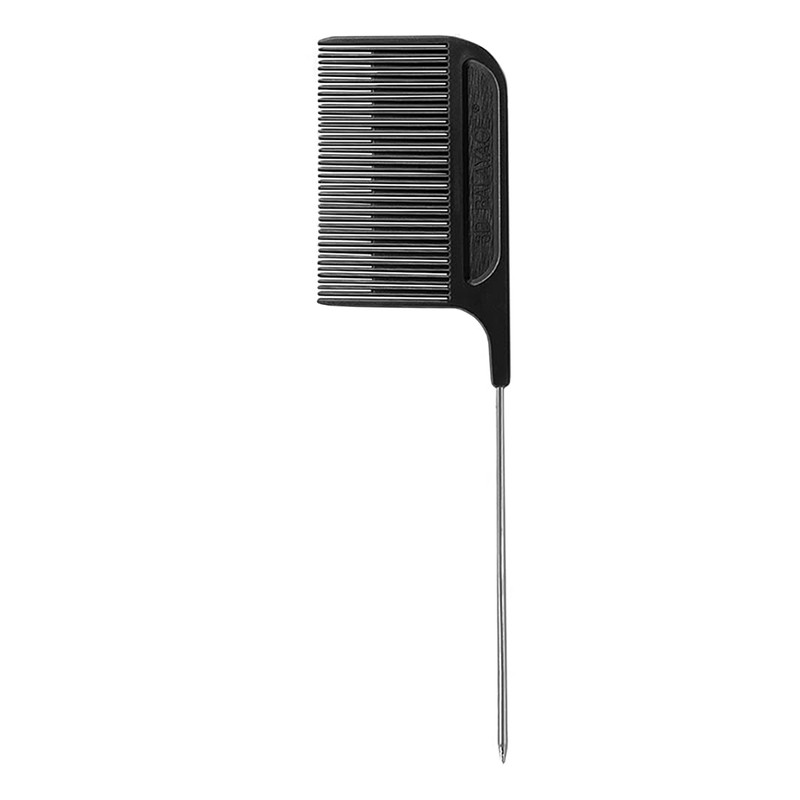 This Comb has a unique way of micro weaving the hair. It splits any size section into two equal 50/50 subsections. The design has a consistent pattern of comb teeth. Every other gap between comb teeth goes half way down the length of the comb, allowing 50 percent of the section to go all the way down and allowing the split. The closeness of the teeth are intended to create an even micro weave. Creating maximum diffused dimension within every section when pre-lightening or coloring the hair. Working half way down the section length of hair will create a tease like effect due to the closeness of the comb teeth. Allowing the person using the comb to create a seamless dimensional result and blend. The handle including a metal tail, allows the user to maximize the use of the comb. This comb is great for stylists that prefer the metal tail for sectioning and all foil work.