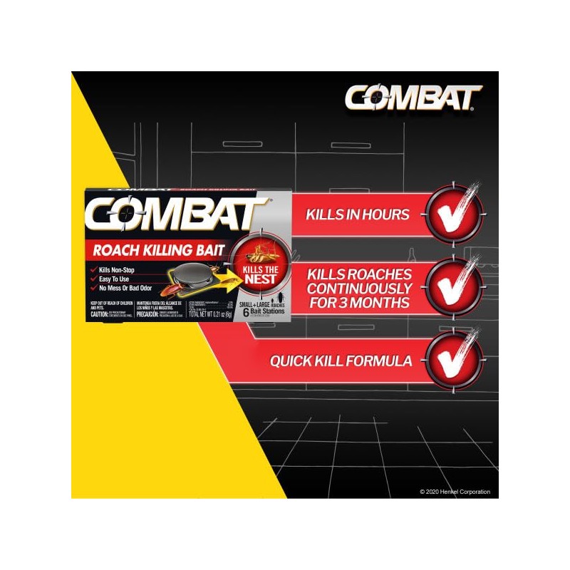 Combat for Small and Large Roaches is formulated with food that attracts both small and large roaches. Best used in areas like under sinks, behind toilets, and behind appliances, Combat for Small and Large Roaches kills roaches in a Domino-Effect, and eliminates at the source of the infestation. This package includes 6 roach killing baits. Directions for Use: It is a violation of federal law to use this product in a manner inconsistent with its labeling.1. Use all 6 baits. Do not remove labels on bait stations. For indoor use. Place baits wherever you see or have seen roaches in the following places: under appliances and sinks, on floor along baseboards and inside cabinets and drawers.2. Place baits properly so they are touching walls and corners. Do not use sprays or foggers around baits.3. Replace all 6 baits every 3 months, or sooner if roaches return.