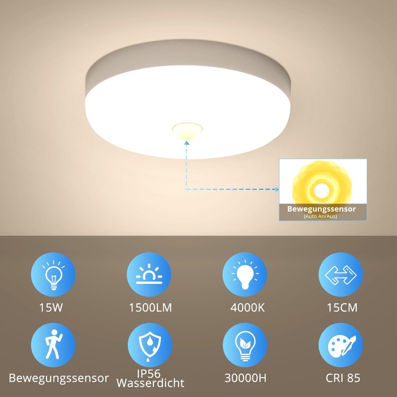 - 15 CM Deckenlampe mit Bewegungssensor: Diese Deckenleuchte ist mit einem fortschrittlichen Bewegungssensor ausgestattet. Das LED-Lampen wird automatisch aktiviert, sobald eine Bewegung innerhalb eines Erfassungsbereichs von 3?C5 Metern erkannt wird. Das Licht schaltet sich automatisch aus, wenn 30 Sekunden lang keine Bewegung erfolgt. Hinweis: Es gibt keinen D?mmerungssensor, das Licht schaltet sich auch dann ein, wenn tags??ber eine Bewegung erkannt wird. Erfassungszeit und Erfassungsabstand sind nicht einstellbar.