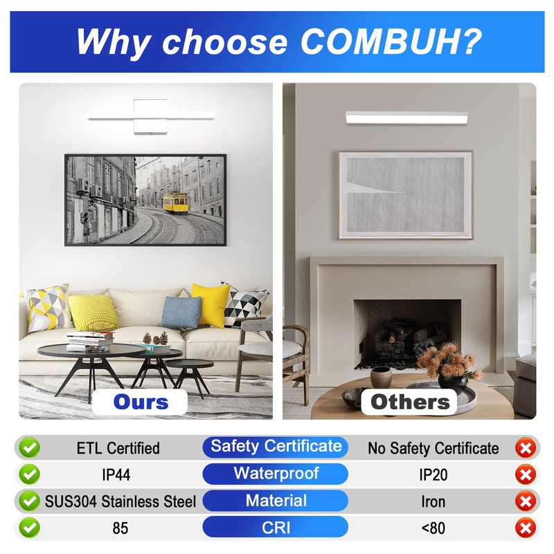 Combuh bathroom light fixtures have undergone strict quality inspection, and the average lifespan time is up to 25000 hours.