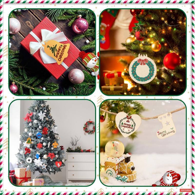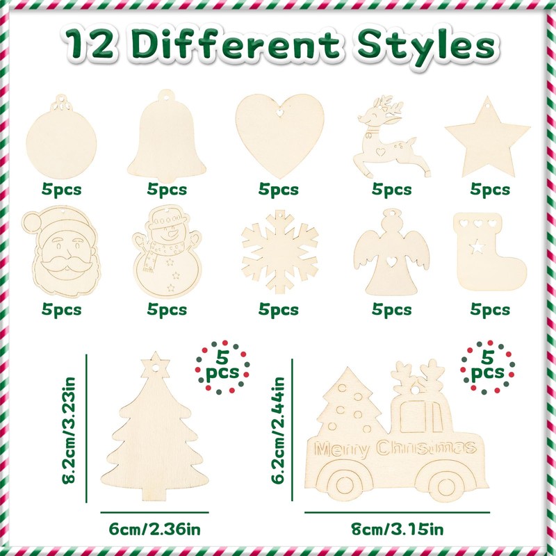 • 60 Laser-Cut Wood Shapes: 12 designs x 5 each (Trees, Stars, Trucks, Socks, Hearts, Bells, Reindeers, Rounds, Snowman, Santa, Snowflakes, Angels)