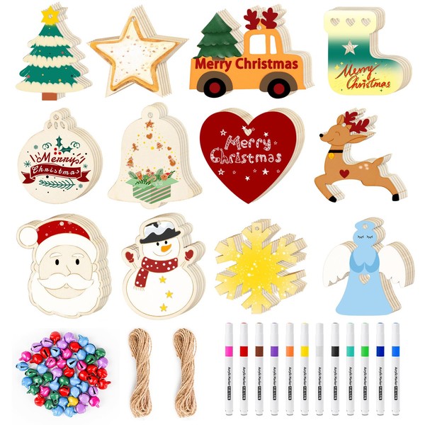 • COMPLETE CHRISTMAS CRAFT KIT:60 Pieces laser-cut wooden ornaments (12 unique designs x 5 each) + Precisely 60 Bells + 2 Bundles Hemp Ropes+ Premium 12-Color Markers in Sturdy Case - Everything for DIY magic!