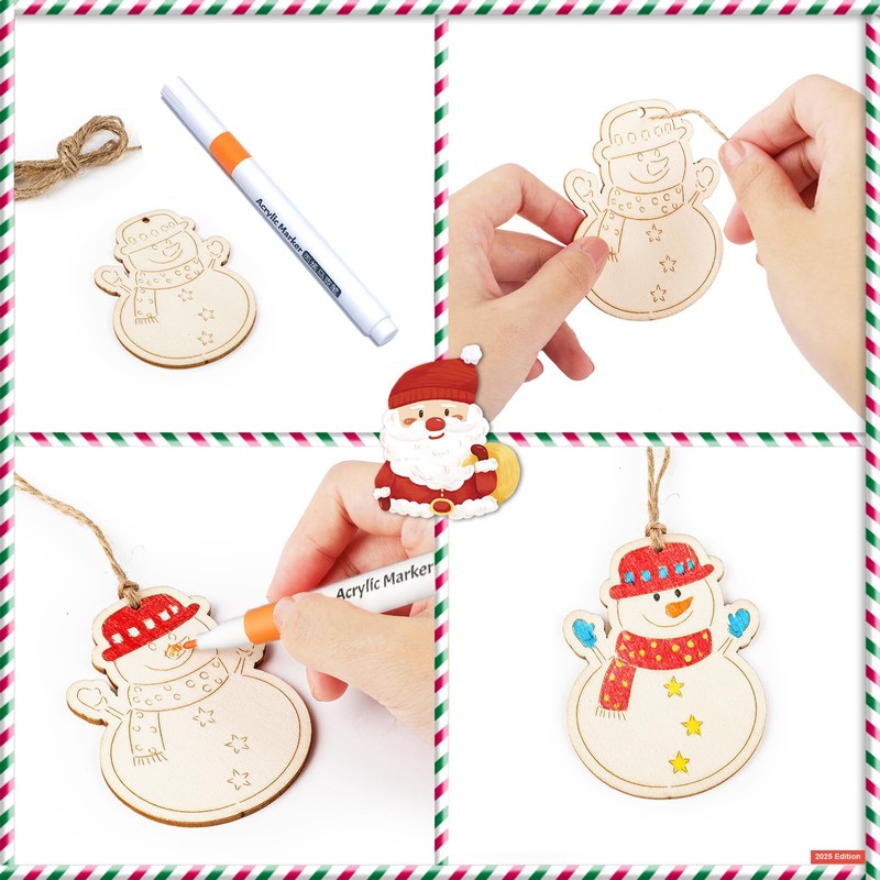 Comesix 60 PCS DIY Wooden Christmas Ornaments to Paint Kit with 60 Bells, 2 Ropes & Upgraded Markers - 12 Styles Tree Hanging Decorations (2025 Edition)