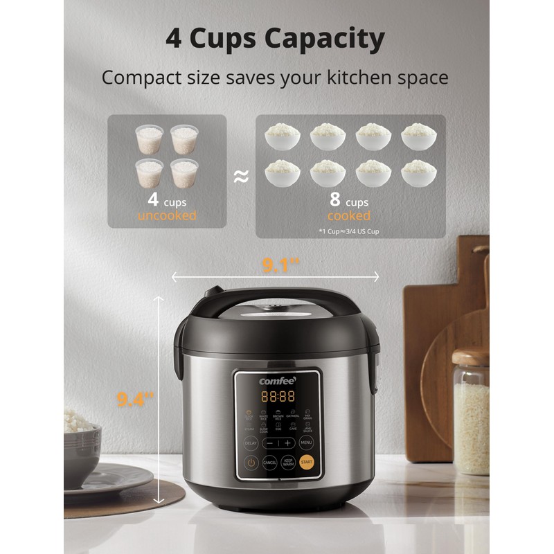 COMFEE' rice cooker has a compact size but ultimate versatility. 4 cups capacity and 12 presets release your cooking talent easily. Cleaning is a breeze with non-stick inner pot. Steam backet allow you up steaming and down boiling at the same time!