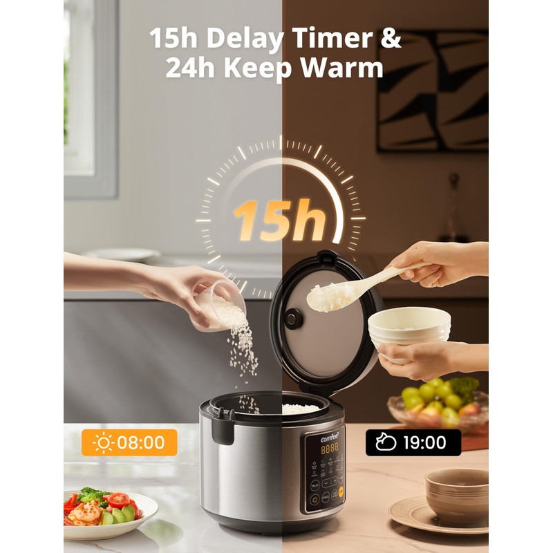 - Easy to Use: The user-friendly design features a digital panel with an LED display that automatically switches to a keep warm feature for 24 hours when cooking is finished. A 15-hour delay timer function allows your to plan your meals in advance and be ready when you need a delicious dinner.