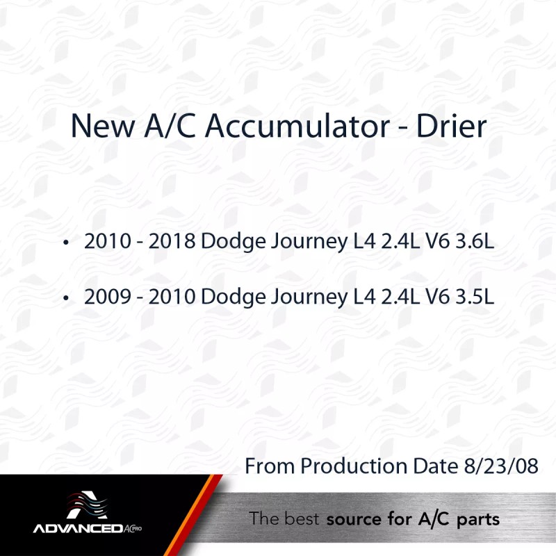 New A/C Accumulator - Drier( From 08/23/2008 )• 2010 2011 2012 2013 2014 2015 2016 2017 2018 Dodge Journey L4 2.4L V6 3.6L • 2009 2010 Dodge Journey L4 2.4L V6 3.5L From 08-23-2008 no