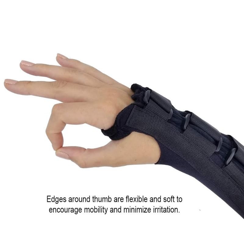 - ALUMINUM SPLINT INSERT IS PRE-BENT 15° - to stabilize and limit wrist mobility allowing the wrist to rest to help reduce pain, inflammation and encourage healing. It can be removed to adjust angle or to allow for additional mobility. Metal support is 7” x 1” and extends from the end of the wrist brace to the palm of the hand.