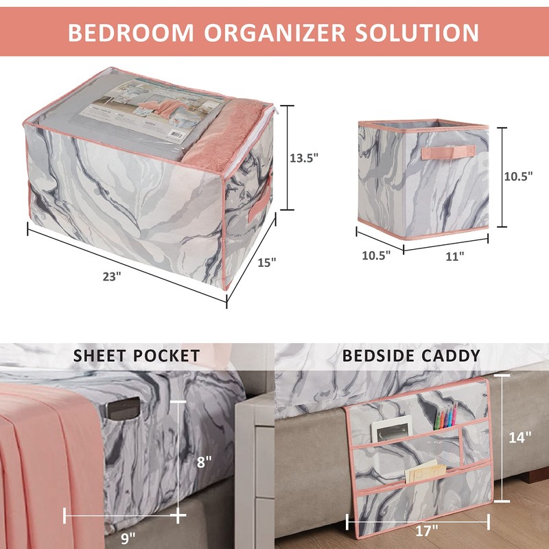 - Set includes: 1 Comforter: 76"W x 90"L, 2 Standard Shams: 20"W x 26"L, 1 Flat sheet & Tapestry: 81"W x 96"L, 1 Flat sheet: 81"W x 96"L, 2 Fitted sheets: 54"W x 75"L + 13"D, 4 Pillowcases: 20"W x 32"L, 1 Headboard pillow: 24"W x 30"L, 1 Throw: 50"W x 60"L, 1 Pillow: 16"W x 16"L, 1 Bedside Caddy cardboard: 17"W x 14"H, 1 Collapsible Storage Cube: 10.5"W x 10.5"L x 11"H, 1 Under bed storage bag: 23"W x 15"L x 15"H