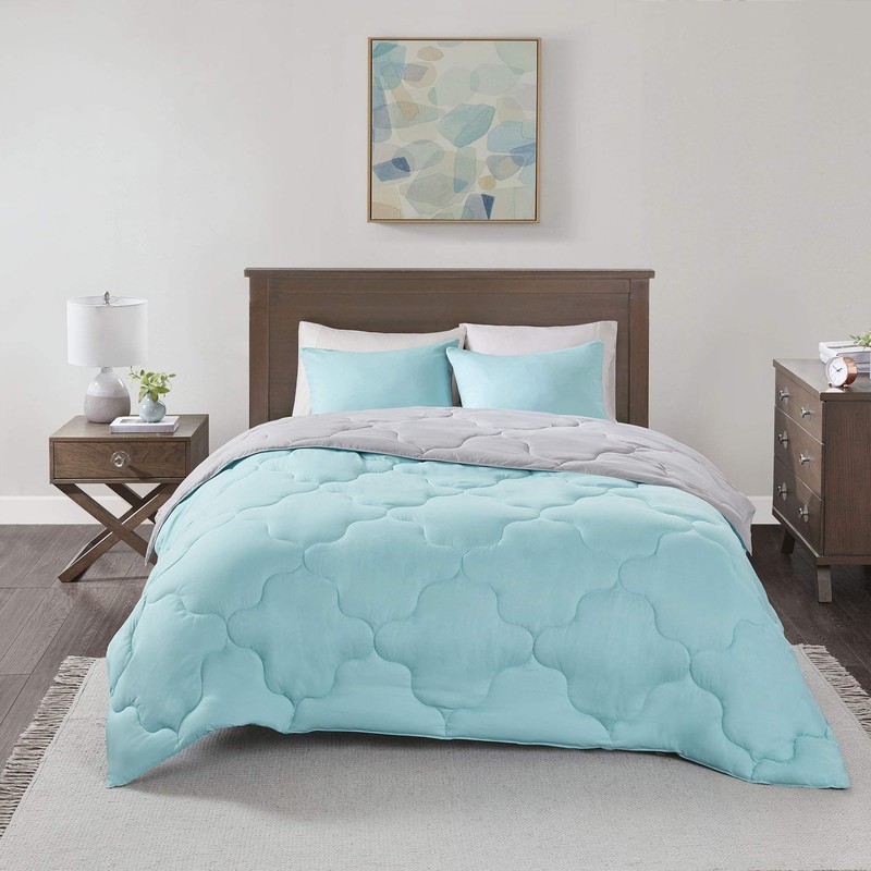 Comfort Spaces Vixie Reversible Comforter Set - Modern Geometric Quaterfoil Cloud Quilted Design, All Season Down Alternative Bedding, Matching Shams, Aqua/Light Gray Full/Queen(90"x90") 3 Piece