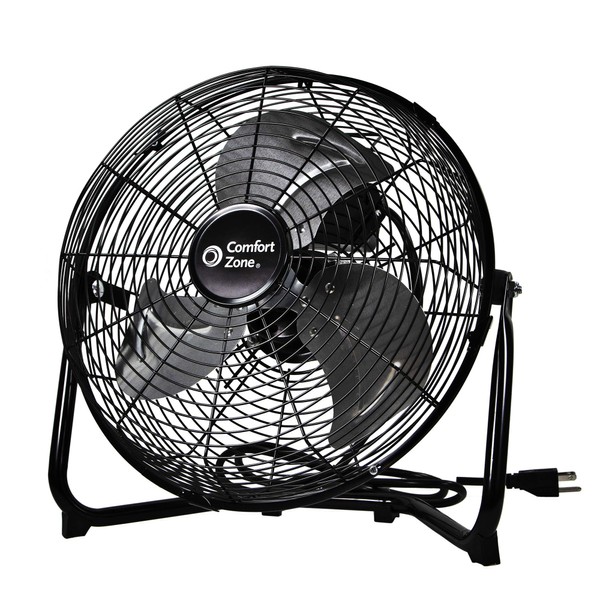 Comfort Zone 12 inch Cradle Fan, 3 Speed Floor or Table Fan with180 Degree Tilt, Metal Construction and Aluminum Blades, Carry Handle, Rubber Feet, Ideal for Bedroom, Workshop, or Garage, Black