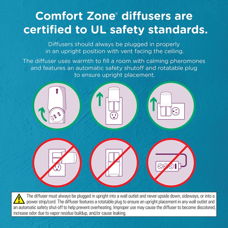 Are your cats Fighting, hissing or showing signs of tension and conflict? These behaviors can be signs that your cats are stressed or anxious. Cats are very territorial and adding another cat into a multi-cat home can cause the cats to feel threatened and stressed. Comfort Zone multi-cat diffusers dispense a drug-free vapor that mimics a cat's natural calming pheromones to create a calming environment which helps reduce your cats' Tension and conflict. These pheromones are diffused into the air which Signal to your cats that the area is safe, making your cats feel more comfortable. Use The Comfort Zone multi-cat diffuser kit if you see your cats Fighting or showing signs of tension and conflict. Plug in a diffuser into each room where your cats roam or spend the most time. Replace the refill every 30 days and the diffuser unit Every 12 months. Our products are SAFE and certified to U.L standards.