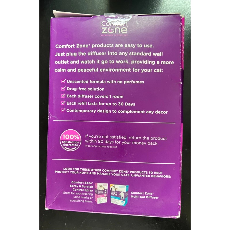 This is a Comfort Zone Two Room Calming Diffuser Kit . It is made in the United States and is designed to create a calming environment for pets. The kit is new and sealed, providing a convenient solution for pet owners looking to reduce stress and anxiety in their cats.