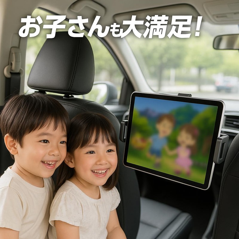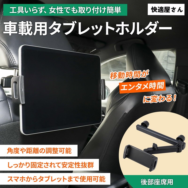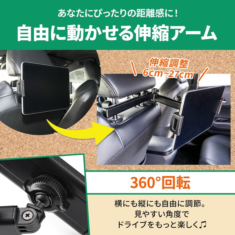 - Product Features and Benefits: Compatible with Tablets from 4.7 to 9.8 inches (12 to 25 cm): Use a wide range of devices in one unit. 360° Rotation & Angle Adjustment: You can freely adjust the distance between the front and back of the screen. Enjoy a wide range of scenes including videos, games, online meetings and more. Aluminum alloy arm with a sense of stability: Designed to provide a firm hold and resist vibration while driving. Easy Installation: It can be installed on the headrest pole of your car without any tools, so anyone can set it up quickly. Foldable for Easy Carrying: When not in use, it can be stored compactly and can be used in multiple vehicles