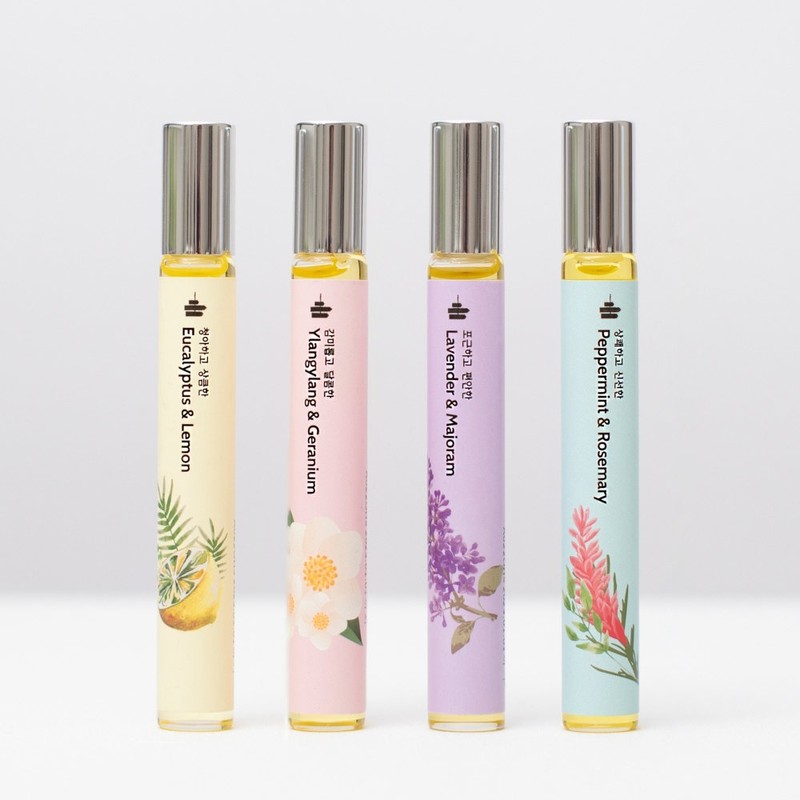 - How to use: 1. Apply lightly to pulse points such as under the ears, back of the neck, shoulders, between the eyebrows, temples, and wrists. 2. Because it is blended with vegetable carrier oils (jojoba seed oil, sweet almond oil), you can feel a deeper aromatherapy after 2 to 5 minutes. 3. How to use by product type (1) Peppermint & Rosemary: Apply directly to muscles or uncomfortable areas caused by stress. It is better to apply to the temples and the center of the back of the neck when concentration is required, such as driving or studying. (2) Eucalyptus & Lemon: Apply to the philtrum, sides of the nose (ankle), and between the eyebrows (pharyngeal sinus). Sometimes, it is better to apply it on a cotton swab and apply it inside the nose. (3) Lavender & Marjoram: Apply lightly from the solar plexus to the sternum and let it absorb. (4) Fine & Frankincense: Apply to the required area and massage lightly. (5) Ylang Ylang & Geranium: It is composed of essential oils, so it can be used as perfume. For women, it is especially helpful to apply it to the panty line and lower abdomen and massage it. It is also recommended for the armpit area.