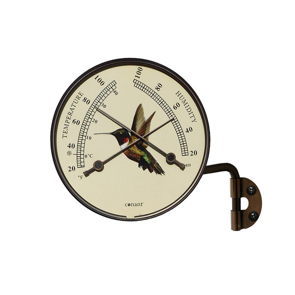 This decorative window comfortmeter features a crisscrossing dial face with opposing temperature and humidity gauges. Accented with a beautiful hummingbird dial and handsome bronze patina finish, it will surely enhance any view. Anodized aluminum.